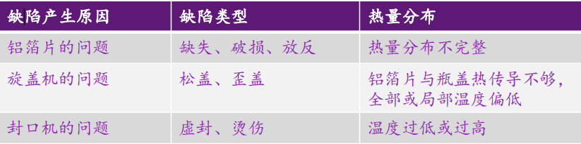鋁箔片被電磁加熱之后,一方面融化熱封膜完成封口,另一方面通過熱傳導(dǎo)將熱量傳遞到瓶蓋,此時可以通過紅外熱成像相機(jī)捕捉到瓶蓋表面的熱量分布。此熱量分布直接反映的是墊片與瓶蓋的壓緊程度,而壓緊程度間接地反映出封口質(zhì)量。當(dāng)有封口缺陷產(chǎn)生時,熱量分布會出現(xiàn)異常,其對應(yīng)關(guān)系如下: